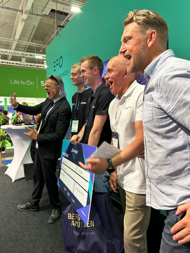 Fra prisutdelingen under Eliaden 2024: Vinner, Mathias Kolseth, og medfinalist, Vegard Moene, med konferansier Alex Rosén og fagjurymedlemmene: markedsdirektør hos Berggård Amundsen, Hans Ketil Andresen, salgsdirektør i Prysmian Group, Espen Pettersen, faglig ansvarlig i Horten Elektro og dreven foredragsholder, Patrick Loe.